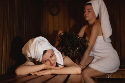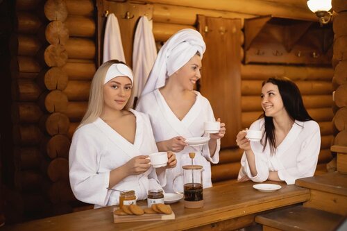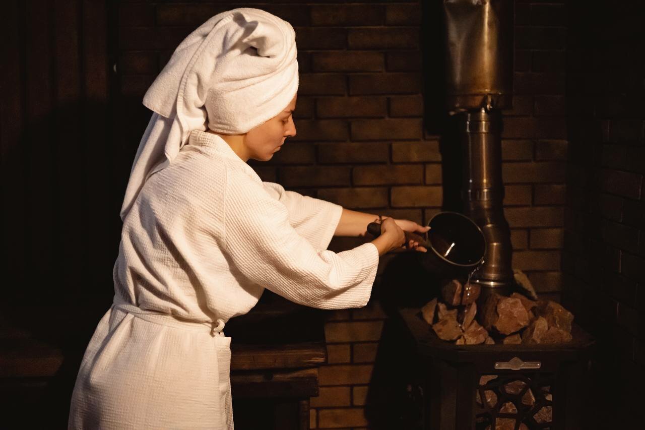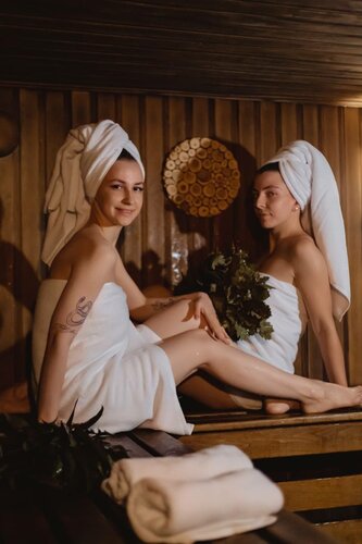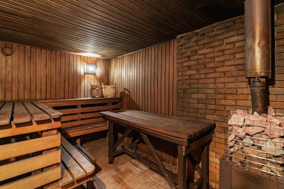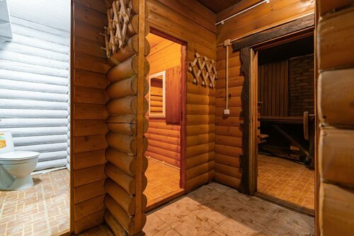 Внутри вас встретит теплота натурального дерева и атмосфера, способствующая отдыху. Русская печка, источающая неповторимый аромат, обеспечит мягкое тепло, идеально подходящее для парения. Насладитесь настоящим ритуалом с березовыми, дубовыми и даже из канадского дуба вениками, погружаясь в атмосферу настоящей русской бани.